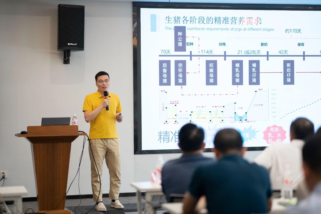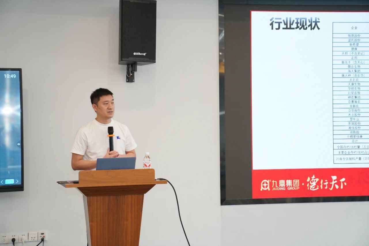 ▲集團研發(fā)中心總經理江書忠介紹了《家庭農場養(yǎng)豬E平臺》和《通過體況管理提升母豬生產成績》